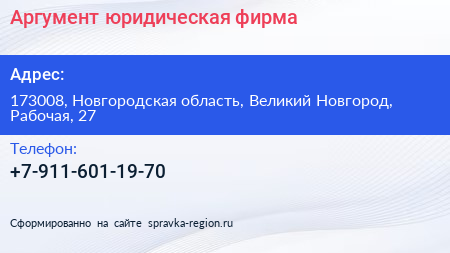 Аргумент, юридическая фирма по адресу 173008, Новгородская область, Великий Новгород, Рабочая, 27 в дальнейшем Организация, размещена в следующих категориях: