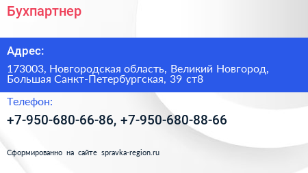 Бухпартнер по адресу 173003, Новгородская область, Великий Новгород, Большая Санкт-Петербургская, 39 ст8 в дальнейшем Организация, размещена в следующих категориях: