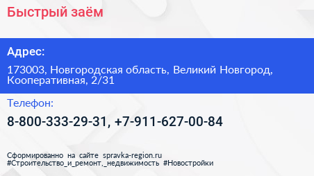 Быстрый заём по адресу 173003, Новгородская область, Великий Новгород, Кооперативная, 2/31 в дальнейшем Организация, размещена в следующих категориях: