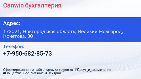 Canwin, бухгалтерия по адресу 173021, Новгородская область, Великий Новгород, Кочетова, 30 в дальнейшем Организация, размещена в следующих категориях: