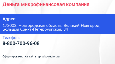 Деньга, микрофинансовая компания по адресу 173003, Новгородская область, Великий Новгород, Большая Санкт-Петербургская, 34 в дальнейшем Организация, размещена в следующих категориях:
