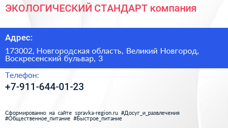 ЭКОЛОГИЧЕСКИЙ СТАНДАРТ, компания по адресу 173002, Новгородская область, Великий Новгород, Воскресенский бульвар, 3 в дальнейшем Организация, размещена в следующих категориях: