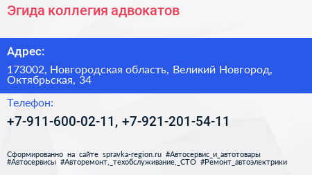 Эгида, коллегия адвокатов по адресу 173002, Новгородская область, Великий Новгород, Октябрьская, 34 в дальнейшем Организация, размещена в следующих категориях: