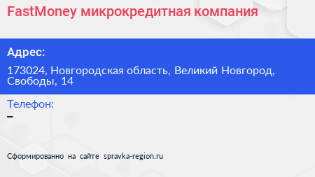 FastMoney, микрокредитная компания по адресу 173024, Новгородская область, Великий Новгород, Свободы, 14 в дальнейшем Организация, размещена в следующих категориях:
