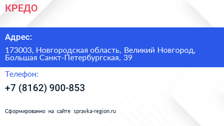 КРЕДО по адресу 173003, Новгородская область, Великий Новгород, Большая Санкт-Петербургская, 39 в дальнейшем Организация, размещена в следующих категориях: