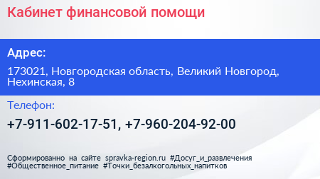 Кабинет финансовой помощи по адресу 173021, Новгородская область, Великий Новгород, Нехинская, 8 в дальнейшем Организация, размещена в следующих категориях: