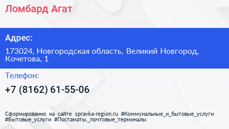 Ломбард-Агат по адресу 173024, Новгородская область, Великий Новгород, Кочетова, 1 в дальнейшем Организация, размещена в следующих категориях: