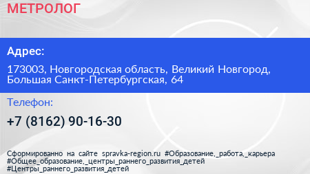 МЕТРОЛОГ по адресу 173003, Новгородская область, Великий Новгород, Большая Санкт-Петербургская, 64 в дальнейшем Организация, размещена в следующих категориях:
