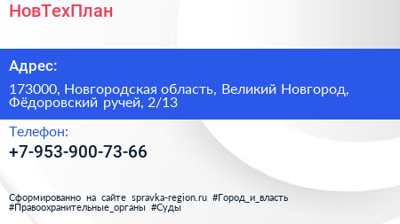 НовТехПлан по адресу 173000, Новгородская область, Великий Новгород, Фёдоровский ручей, 2/13 в дальнейшем Организация, размещена в следующих категориях: