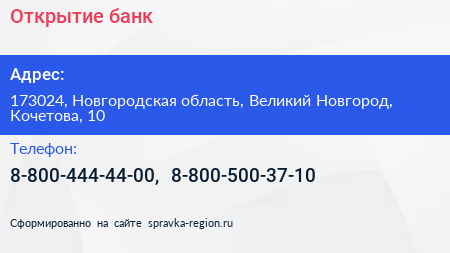 Открытие, банк по адресу 173024, Новгородская область, Великий Новгород, Кочетова, 10 в дальнейшем Организация, размещена в следующих категориях: