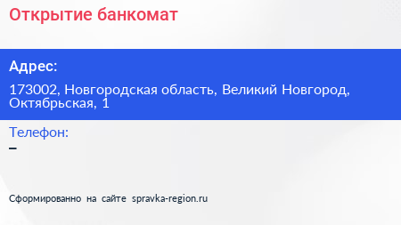 Открытие, банкомат по адресу 173002, Новгородская область, Великий Новгород, Октябрьская, 1 в дальнейшем Организация, размещена в следующих категориях: