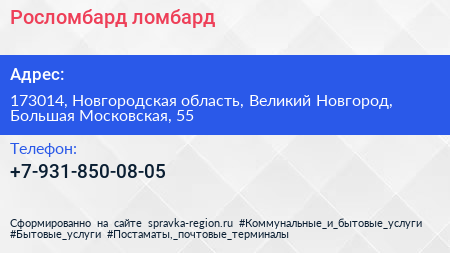 Росломбард, ломбард по адресу 173014, Новгородская область, Великий Новгород, Большая Московская, 55 в дальнейшем Организация, размещена в следующих категориях: