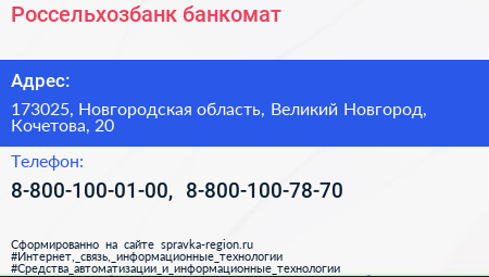 Россельхозбанк, банкомат по адресу 173025, Новгородская область, Великий Новгород, Кочетова, 20 в дальнейшем Организация, размещена в следующих категориях: