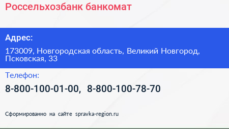 Россельхозбанк, банкомат по адресу 173009, Новгородская область, Великий Новгород, Псковская, 33 в дальнейшем Организация, размещена в следующих категориях:
