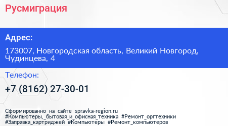 Русмиграция по адресу 173007, Новгородская область, Великий Новгород, Чудинцева, 4 в дальнейшем Организация, размещена в следующих категориях: