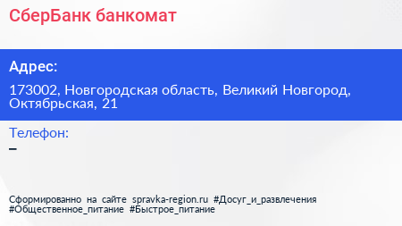 СберБанк, банкомат по адресу 173002, Новгородская область, Великий Новгород, Октябрьская, 21 в дальнейшем Организация, размещена в следующих категориях: