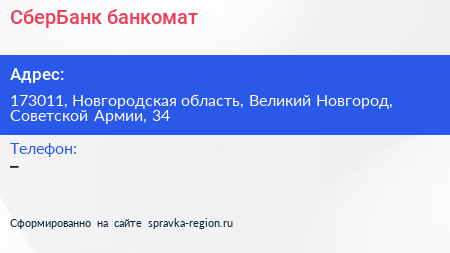 СберБанк, банкомат по адресу 173011, Новгородская область, Великий Новгород, Советской Армии, 34 в дальнейшем Организация, размещена в следующих категориях: