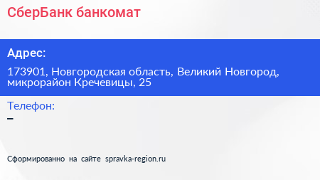 СберБанк, банкомат по адресу 173901, Новгородская область, Великий Новгород, микрорайон Кречевицы, 25 в дальнейшем Организация, размещена в следующих категориях: