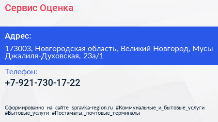Сервис Оценка по адресу 173003, Новгородская область, Великий Новгород, Мусы Джалиля-Духовская, 23а/1 в дальнейшем Организация, размещена в следующих категориях: