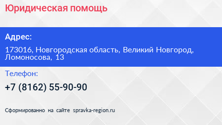 Юридическая помощь по адресу 173016, Новгородская область, Великий Новгород, Ломоносова, 13 в дальнейшем Организация, размещена в следующих категориях:
