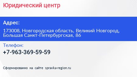 Юридический центр по адресу 173008, Новгородская область, Великий Новгород, Большая Санкт-Петербургская, 86 в дальнейшем Организация, размещена в следующих категориях: