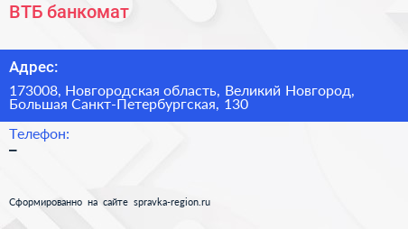 ВТБ, банкомат по адресу 173008, Новгородская область, Великий Новгород, Большая Санкт-Петербургская, 130 в дальнейшем Организация, размещена в следующих категориях: