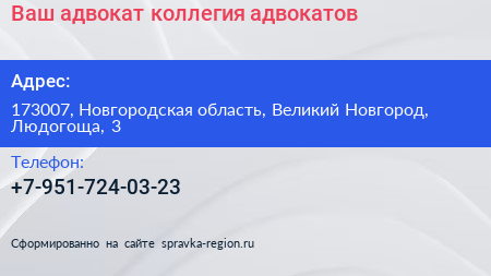 Ваш адвокат, коллегия адвокатов по адресу 173007, Новгородская область, Великий Новгород, Людогоща, 3 в дальнейшем Организация, размещена в следующих категориях: