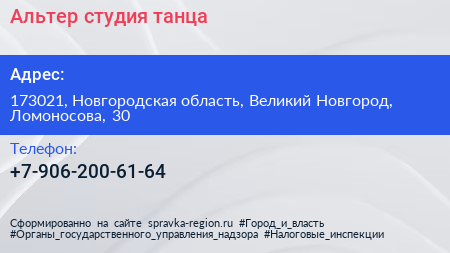 Альтер, студия танца по адресу 173021, Новгородская область, Великий Новгород, Ломоносова, 30 в дальнейшем Организация, размещена в следующих категориях: