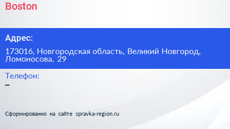 Boston по адресу 173016, Новгородская область, Великий Новгород, Ломоносова, 29 в дальнейшем Организация, размещена в следующих категориях: