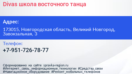 Divas, школа восточного танца по адресу 173015, Новгородская область, Великий Новгород, Завокзальная, 3 в дальнейшем Организация, размещена в следующих категориях: