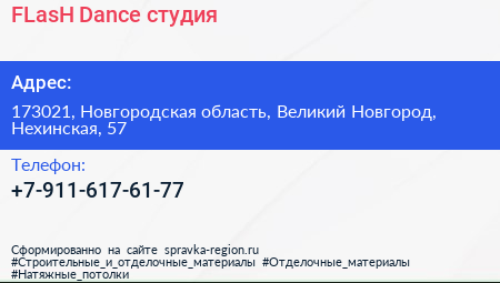 FLasH Dance, студия по адресу 173021, Новгородская область, Великий Новгород, Нехинская, 57 в дальнейшем Организация, размещена в следующих категориях: