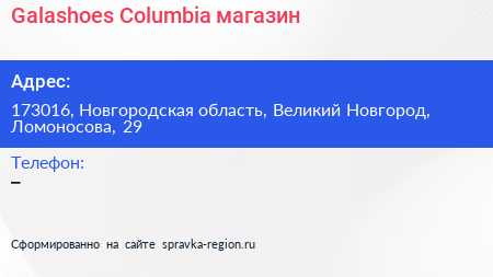 Galashoes Columbia, магазин по адресу 173016, Новгородская область, Великий Новгород, Ломоносова, 29 в дальнейшем Организация, размещена в следующих категориях: