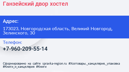 Ганзейский двор, хостел по адресу 173023, Новгородская область, Великий Новгород, Зелинского, 30 в дальнейшем Организация, размещена в следующих категориях: