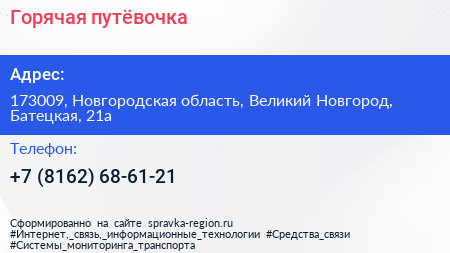 Горячая путёвочка по адресу 173009, Новгородская область, Великий Новгород, Батецкая, 21а в дальнейшем Организация, размещена в следующих категориях: