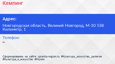Кемпинг по адресу Новгородская область, Великий Новгород, М-10 538 Километр, 1 в дальнейшем Организация, размещена в следующих категориях: