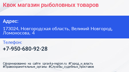 Квок, магазин рыболовных товаров по адресу 173024, Новгородская область, Великий Новгород, Ломоносова, 4 в дальнейшем Организация, размещена в следующих категориях:
