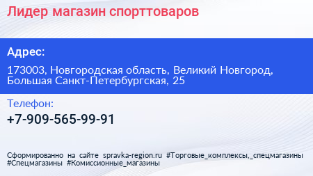 Лидер, магазин спорттоваров по адресу 173003, Новгородская область, Великий Новгород, Большая Санкт-Петербургская, 25 в дальнейшем Организация, размещена в следующих категориях:
