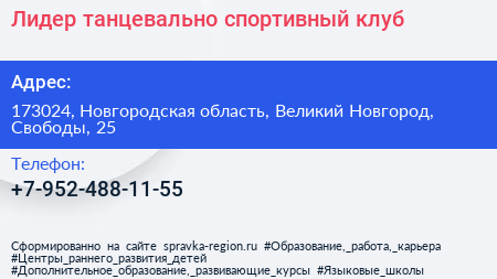 Лидер, танцевально-спортивный клуб по адресу 173024, Новгородская область, Великий Новгород, Свободы, 25 в дальнейшем Организация, размещена в следующих категориях: