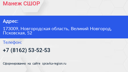 Манеж, СШОР по адресу 173009, Новгородская область, Великий Новгород, Псковская, 52 в дальнейшем Организация, размещена в следующих категориях: