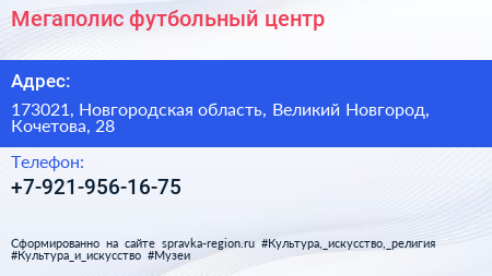 Мегаполис, футбольный центр по адресу 173021, Новгородская область, Великий Новгород, Кочетова, 28 в дальнейшем Организация, размещена в следующих категориях: