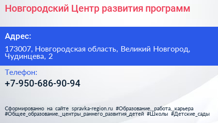 Новгородский Центр развития программ по адресу 173007, Новгородская область, Великий Новгород, Чудинцева, 2 в дальнейшем Организация, размещена в следующих категориях: