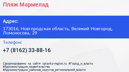 Пляж Мармелад по адресу 173016, Новгородская область, Великий Новгород, Ломоносова, 29 в дальнейшем Организация, размещена в следующих категориях: