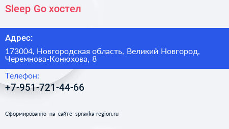 Sleep & Go, хостел по адресу 173004, Новгородская область, Великий Новгород, Черемнова-Конюхова, 8 в дальнейшем Организация, размещена в следующих категориях:
