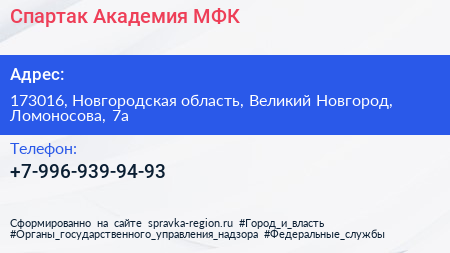 Спартак, Академия МФК по адресу 173016, Новгородская область, Великий Новгород, Ломоносова, 7а в дальнейшем Организация, размещена в следующих категориях: