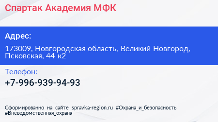Спартак, Академия МФК по адресу 173009, Новгородская область, Великий Новгород, Псковская, 44 к2 в дальнейшем Организация, размещена в следующих категориях: