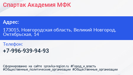 Спартак, Академия МФК по адресу 173015, Новгородская область, Великий Новгород, Октябрьская, 14 в дальнейшем Организация, размещена в следующих категориях: