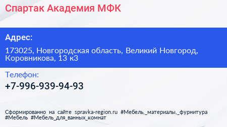 Спартак, Академия МФК по адресу 173025, Новгородская область, Великий Новгород, Коровникова, 13 к3 в дальнейшем Организация, размещена в следующих категориях: