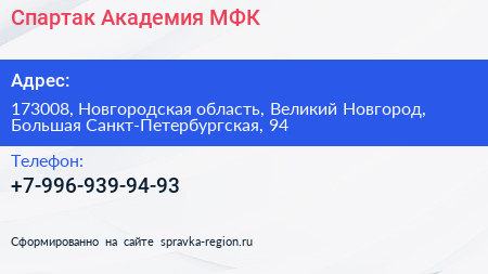 Спартак, Академия МФК по адресу 173008, Новгородская область, Великий Новгород, Большая Санкт-Петербургская, 94 в дальнейшем Организация, размещена в следующих категориях: