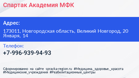 Спартак, Академия МФК по адресу 173011, Новгородская область, Великий Новгород, 20 Января, 14 в дальнейшем Организация, размещена в следующих категориях: