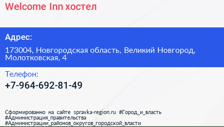 Welcome Inn, хостел по адресу 173004, Новгородская область, Великий Новгород, Молотковская, 4 в дальнейшем Организация, размещена в следующих категориях: